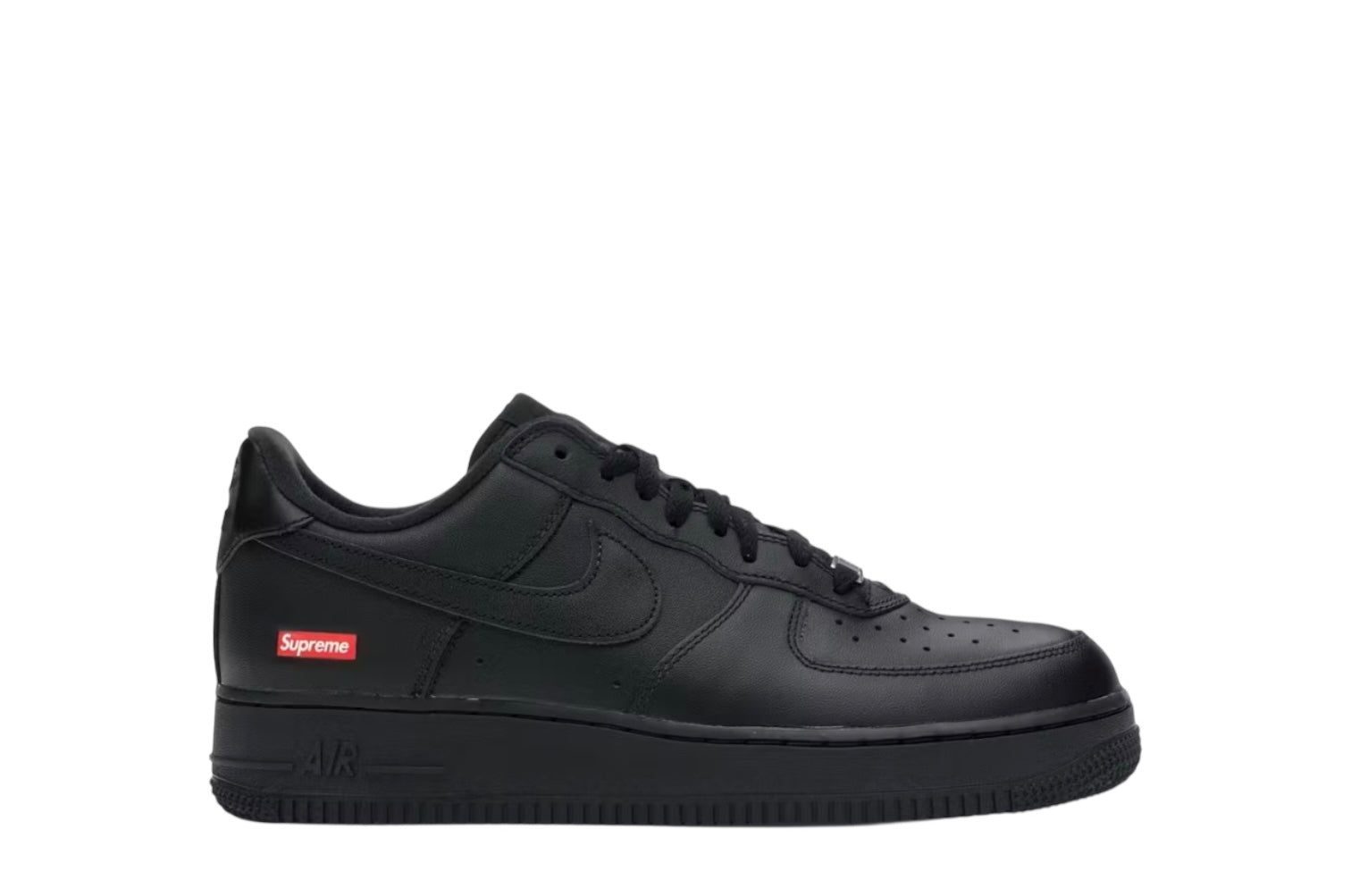 This Air Force 1 Low is comprised of an all-black leather upper with matching soles and detailing. A red Supreme Box Logo placed on the outside heel completes the design.